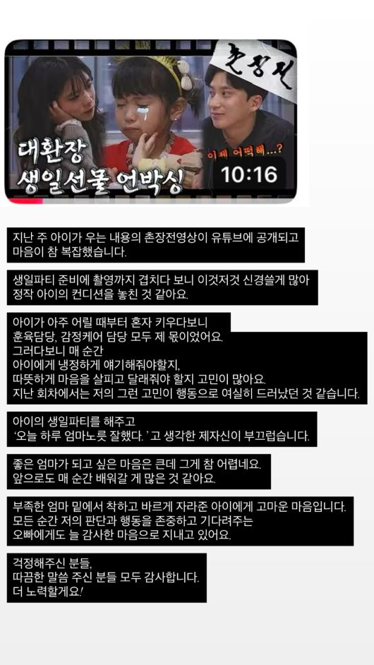 28기 옥순은 "지난 주 아이가 우는 내용의 촌장전 영상이 유튜브에 공개되고 마음이 참 복잡했다. 생일 파티 준비에 촬영까지 겹치다 보니 이것저것 신경 쓸 게 많아 정작 아이의 컨디션을 놓친 것 같다"고 반성했다.