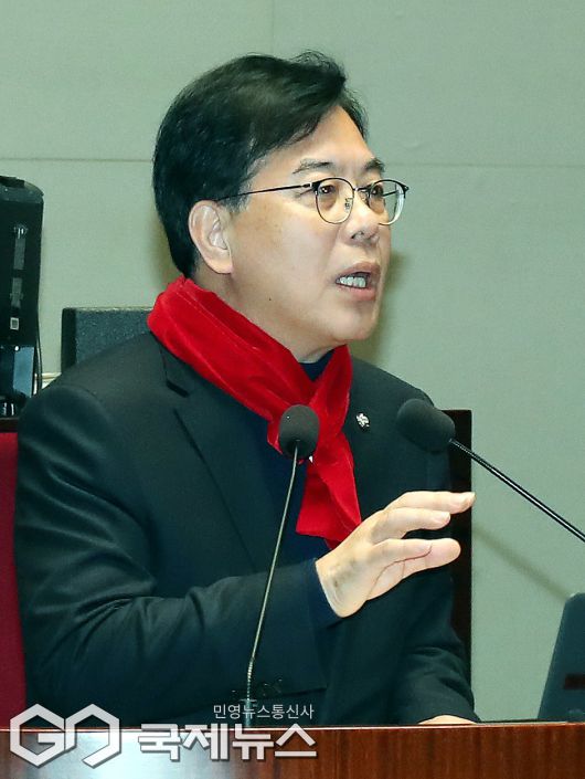 (서울=국제뉴스) 송언석 국민의힘 원내대표가 21일 서울 여의도 국회에서 열린 긴급 의원총회에서 발언하고 있다./사진=이용우 기자