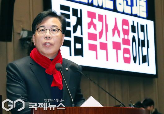 (서울=국제뉴스) 송언석 국민의힘 원내대표가 21일 서울 여의도 국회에서 열린 긴급 의원총회에서 발언하고 있다./사진=이용우 기자