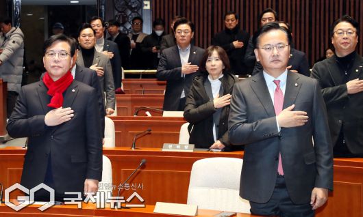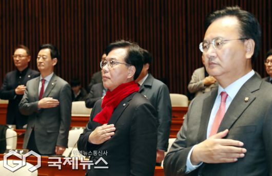 (서울=국제뉴스) 국민의힘 송언석 원내대표와의원들이21일 서울 여의도 국회에서 열린 긴급 의원총회에서국민의례를 하고 있다./사진=이용우 기자