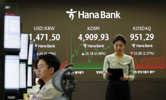 21일 서울 중구 하나은행 딜링룸 현황판. 연합뉴스 |