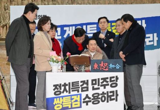 송언석 국민의힘 원내대표와 중진 의원들이 21일 국회 로텐더홀에서 '통일교·공천헌금' 쌍특검법 수용 촉구하며 이레째 단식을 이어가고 있는 장동혁 대표를 찾아 대화하고 있다. <ⓒ투자가를 위한 경제콘텐츠 플랫폼, 아시아경제(www.asiae.co.kr) 무단전재 배포금지>