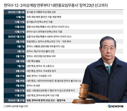 '관운의 사나이'란 별명처럼 50년 동안 공직 생활을 이어온 한 전 총리는 계엄 선포 이후 수사기관의 전방위 조사, 제21대 대선 출마 시도, 내란 특검 출범 등 우여곡절을 거듭한 끝에 중형을 선고받으며 초라하게 퇴장하게 됐다.