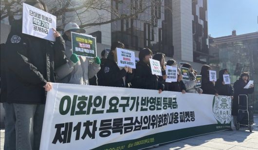 이화여대 중앙운영위원회 소속 학생들이 등록금 인상에 학생들의 의견을 반영하라며 피켓팅 시위를 진행하고 있다. [이화여대 SNS 갈무리] |
