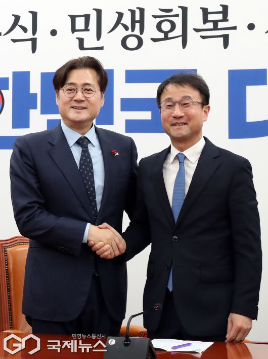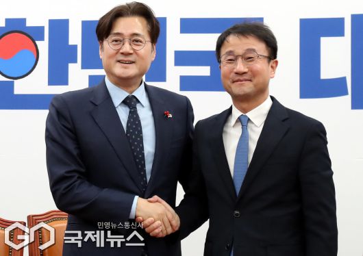 (서울=국제뉴스) 한병도 더불어민주당 원내대표가 21일 오후 서울 여의도 국회에서 홍익표 대통령비서실 정무수석을 접견하며 악수를 하고 있다./사진=이용우 기자
