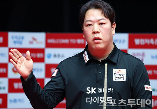 [고양(경기)=스포츠투데이 팽현준 기자] 21일 경기도 고양 킨텍스 PBA스타디움에서 열린 '웰컴저축은행 PBA 팀리그 2025-2026' 하나카드와 SK렌터카의 챔피언결정전 5차전, 4세트 혼합복식 SK렌터카 강동궁이 조예은의 샷을 보며 황당한 표정을 짓고 있다. 2026.01.21. [스포츠투데이 팽현준 기자 sports@stoo.com]