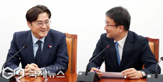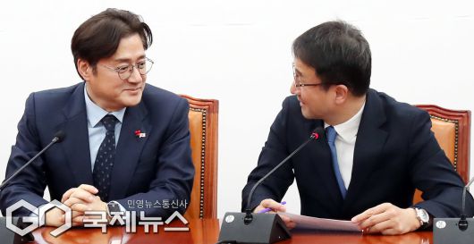 (서울=국제뉴스) 한병도 더불어민주당 원내대표가 21일 오후 서울 여의도 국회에서 홍익표 대통령비서실 정무수석과 대화하고 있다./사진=이용우 기자