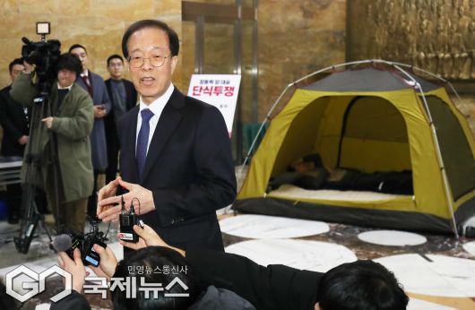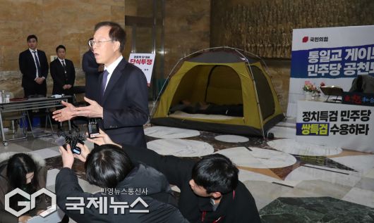 (서울=국제뉴스) 이석연 국민통합위원장이 21일 서울 여의도 국회 로텐더홀에서 이레째 단식농성중인 장동혁 국민의힘 대표를 만난 뒤 취재진에게 입장을 밝히고 있다./사진=이용우 기자