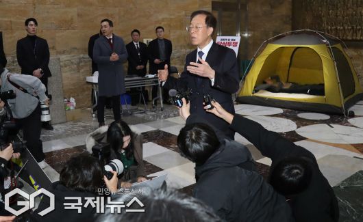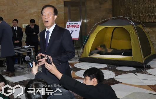(서울=국제뉴스) 이석연 국민통합위원장이 21일 서울 여의도 국회 로텐더홀에서 이레째 단식농성중인 장동혁 국민의힘 대표를 만난 뒤 취재진에게 입장을 밝히고 있다./사진=이용우 기자