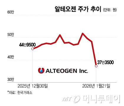 이날 한국거래소 증시에서 알테오젠은 전날 대비 10만7500원(22.35%) 내린 37만3500원에 거래를 마쳤다.