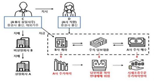 조사 결과 C씨는 상장사 A와 해당 회사 최대주주인 비상장사 B의 실질적 지배주주다. B사가 보유한 A사 주식의 70~80%를 담보로 약 200억원의 차입금을 조달한 상태였다. 이후 A사 주가 하락으로 담보주식 반대매매 위험이 커지자, A사 직원 D씨에게 지시해 B사 계좌를 활용한 시세조종에 나선 것으로 드러났다.