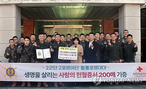 (춘천=연합뉴스) 21일 강원 춘천시 강원혈액원을 방문한 육군 제2포병여단 철통포병대대 장병들이 자발적으로 모은 헌혈증서 200장을 전달한 뒤 기념 촬영하고 있다. 2026.1.21 [육군 제2포병여단 제공. 재판매 및 DB 금지]
