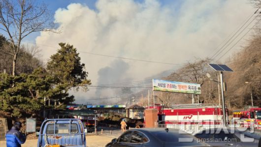이번 산불은 묵백리 주택에서 발생한 화재가 산으로 번지며 확대된 것으로 전해졌다.