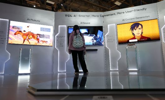 CES 개막일인 지난 6일(현지시간) 미국 네바다주 라스베이거스 컨벤션센터(LVCC)에 중국 전자제품 회사 TCL의 부스에 AI TV가 전시돼 있다. 연합뉴스 |