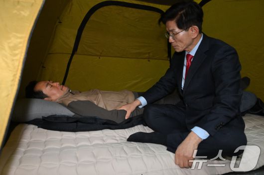 (서울=뉴스1) 신웅수 기자 = 단식 중인 장동혁 국민의힘 대표가 21일 서울 여의도 국회 로텐더홀 단식 농성장을 찾은 김문수 전 고용노동부 장관과 대화하고 있다. (공동취재) 2026.1.21/뉴스1 Copyright ⓒ 뉴스1. All rights reserved. 무단 전재 및 재배포, AI학습 이용 금지.