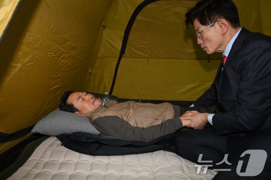 (서울=뉴스1) 신웅수 기자 = 단식 중인 장동혁 국민의힘 대표가 21일 서울 여의도 국회 로텐더홀 단식 농성장을 찾은 김문수 전 고용노동부 장관과 대화하고 있다. (공동취재) 2026.1.21/뉴스1