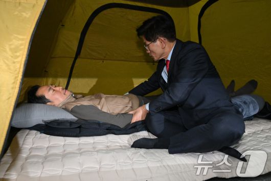 (서울=뉴스1) 신웅수 기자 = 단식 중인 장동혁 국민의힘 대표가 21일 서울 여의도 국회 로텐더홀 단식 농성장을 찾은 김문수 전 고용노동부 장관과 대화하고 있다. (공동취재) 2026.1.21/뉴스1