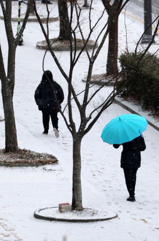 목요일인 22일 광주와 전남 지역에 아침 기온이 -10도 안팎까지 떨어지는 강력한 한파가 예보됐다. 사진은 21일 광주 서구 치평동에서 시민들이 눈이 내리고 있는 거리를 걷고 있는 모습. 연합뉴스 |