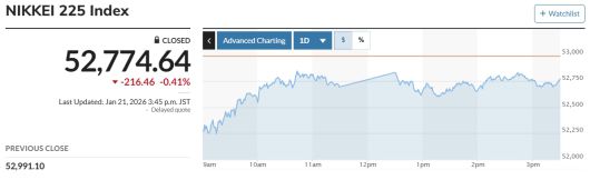 마켓워치에 따르면 일본 증시 대표 지수인 닛케이225(닛케이)는 전 거래일 대비 216.46엔(0.41%) 하락한 5만2774.64엔으로 마감했다. 급락 출발한 토픽스는 마감까지 내림세를 이어갔다. 종가는 전 거래일 대비 35.90포인트(0.99%) 내린 3589.70으로 보합 마감했다.