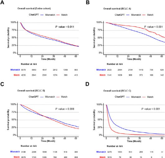 분석 결과, AI 권고와 실제 치료의 일치율은 27~33%로 나타났다. 병기별 하위분석에서는 일부 병기에서 AI 권고와 일치한 치료를 받은 환자군의 생존 차이가 관찰된 반면, 진행성 간암에선 오히려 일치군의 생존이 낮은 경향이 확인됐다.