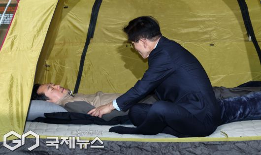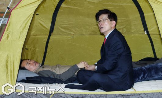 (서울=국제뉴스) 김문수 전 고용노동부 장관이 21일 서울 여의도 국회 로텐더홀에서 통일교·공천헌금 '쌍특검' 수용을 촉구하며 단식중인 장동혁 대표와 대화하고 있다./사진=이용우 기자