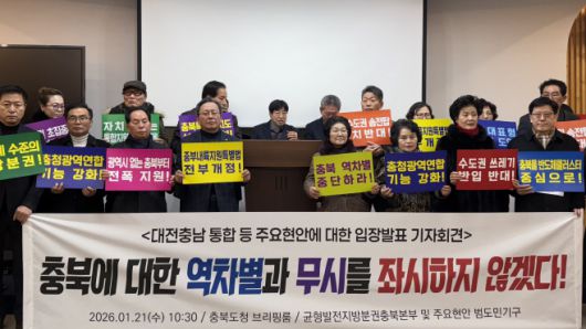 균형발전 지방분권 충북본부 등 7개 단체는 대전·충남 행정통합과 관련해 "중앙정부와 정치권 주도의 졸속 통합"이라며 반대했다.