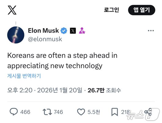 머스크는 20일(현지시각) 자신의 엑스(X) 계정에 "한국인들은 새로운 기술을 받아들이는 데 종종 한발 앞서 있다"(Koreans are often a step ahead in appreciating new technology)고 썼다. 이는 'Teslaconomics'가 테슬라 차량에 대한 한국인들의 반응을 소개하는 글에 머스크가 직접 보낸 답글이다.