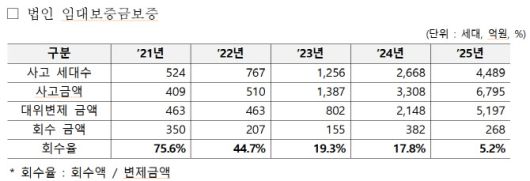 공적 보증의 회수 기능도 급격히 약화됐다. 법인 임대보증 채권 회수율은 2021년 75.6%에서 2022년 44.7%, 2023년 19.3%, 2024년 17.8%로 떨어진 데 이어 작년에는 5.2%까지 추락했다. 연도별 역대 최저치이자 처음으로 한 자릿수를 기록한 것이다. 사고액이 사실상 허그의 손실로 이어지며 공적 부담이 커지는 구조다.