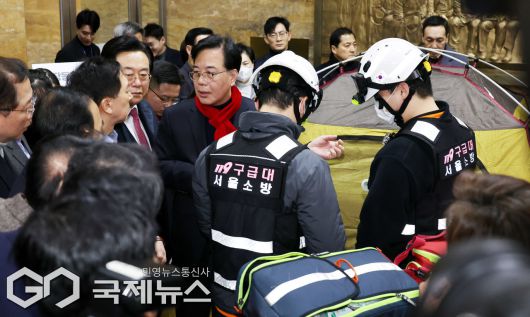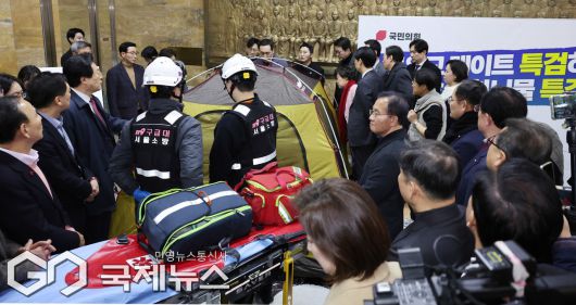 (서울=국제뉴스) 소방 구급대원이 21일 서울 여의도 국회 로텐더홀 장동혁 국민의힘 대표 통일교·공천헌금 '쌍특검' 수용 촉구 단식 농성장에서 대기하고 있다./사진=이용우 기자