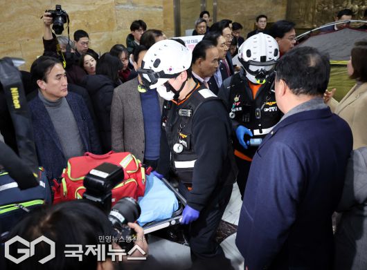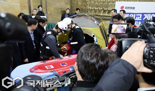 (서울=국제뉴스) 소방 구급대원이 21일 서울 여의도 국회 로텐더홀 장동혁 국민의힘 대표 통일교·공천헌금 '쌍특검' 수용 촉구 단식 농성장에서 장 대표의 이송 거부로 국회를 떠나고 있다./사진=이용우 기자