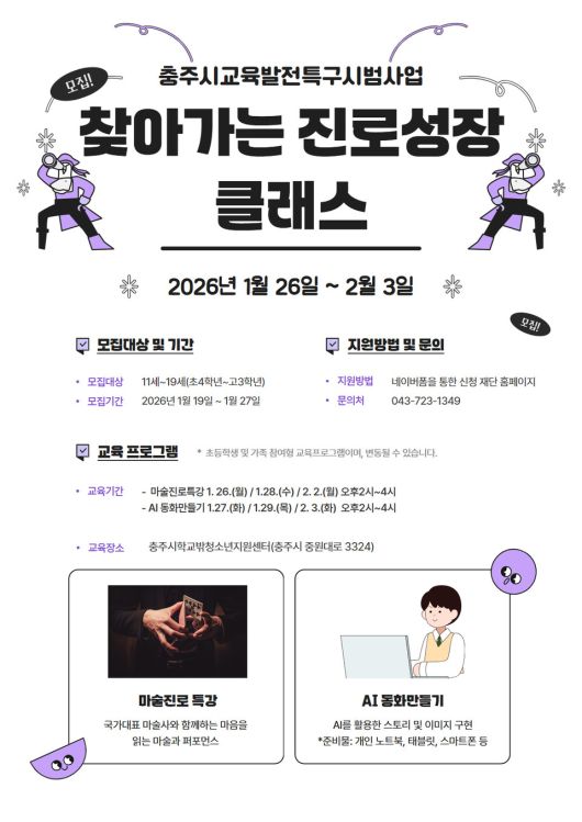 [이현 기자] 충북 충주문화관광재단이 오는 27일까지 겨울방학 청소년 진로특강 '찾아가는 진로성장 클래스' 참가자를 모집한다