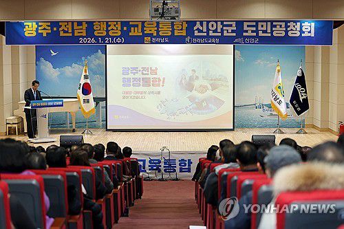 21일 신안군청에서 열린 광주·전남 행정통합 도민공청회에서는 햇빛·바람연금 축소 가능성과 농어촌 전형 유지, 소규모 학교 통폐합, 공무원 인사 이동 문제 등이 핵심 쟁점으로 떠올랐다.