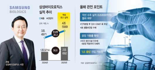 올해도 역대급 실적 행진이 이어질 것이란 관측이 우세하다. 금융정보업체 에프앤가이드에 따르면 시장에서는 삼성바이오로직스의 올해 매출이 5조원을 넘어설 것으로 보고 있다. 삼성바이오로직스도 미래 성장을 위한 구조적 전환과 전략적 투자를 기반으로 올해도 전년 대비 15~20%의 매출 성장이 가능하다고 전망했다. 글로벌 경영 환경 역시 우호적이다. 인적분할 이후 '순수 CDMO사'로 자리매김한 데다, 미국 정부가 추진 중인 생물보안법이 현실화될 경우 중국 리스크를 회피하려는 글로벌 제약사의 수요가 삼성바이오로직스로 이동할 가능성이 크다는 분석이다.