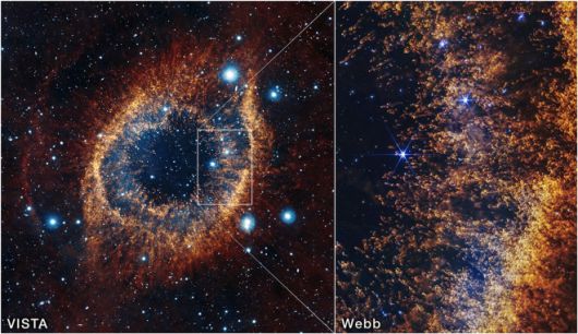 왼쪽은 지상 기반 가시광 및 적외선 망원경으로 촬영한 헬릭스 성운, 오른쪽은 제임스 웹 우주망원경이 촬영한 근접 이미지. ESO, VISTA, NASA, ESA, CSA, STScI, J. Emerson (ESO); Acknowledgment: CASU |