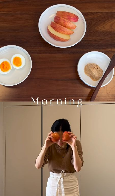 그는 손질한 토마토, 양파, 마늘 등을 올리브오일을 사용해 볶은 뒤, 파스타 면과 섞어 건강한 음식을 직접 준비했다. 여기에 사과와 계란까지 곁들였다.