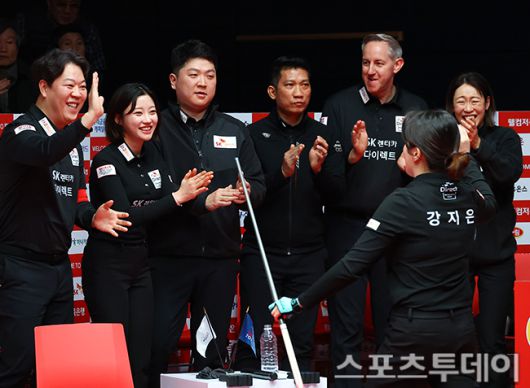 [고양(경기)=스포츠투데이 팽현준 기자] 21일 경기도 고양 킨텍스 PBA스타디움에서 열린 '웰컴저축은행 PBA 팀리그 2025-2026' 하나카드와 SK렌터카의 챔피언결정전 5차전, 세트스코어 3-2로 SK렌터카가 앞서는 상황에서 여자단식에 출전한 SK렌터카 강지은이 하나카드 김가영을 제압하며 승리하고 있다. 챔피언결정전은 6차전으로 이어진다. 2026.01.21.