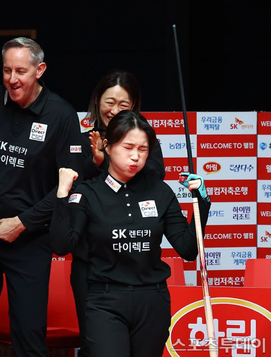 [고양(경기)=스포츠투데이 팽현준 기자] 21일 경기도 고양 킨텍스 PBA스타디움에서 열린 '웰컴저축은행 PBA 팀리그 2025-2026' 하나카드와 SK렌터카의 챔피언결정전 5차전, 세트스코어 3-2로 SK렌터카가 앞서는 상황에서 여자단식에 출전한 SK렌터카 강지은이 하나카드 김가영을 제압하며 승리하고 있다. 챔피언결정전은 6차전으로 이어진다. 2026.01.21.