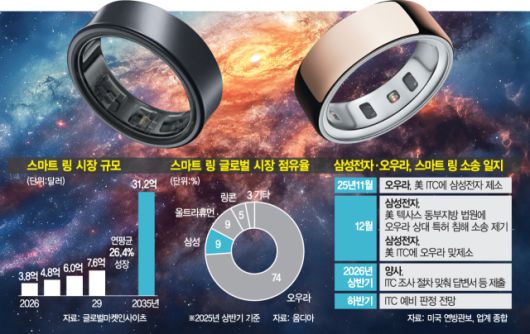 삼성전자 입장에서 오우라는 결코 만만한 상대가 아니다. 시장조사 기관 옴디아에 따르면 오우라는 탄탄한 기술력을 바탕으로 현재 글로벌 스마트링 시장의 74%(2025년 상반기 기준)를 차지하고 있다. 7만여 명의 사용자 데이터를 바탕으로 정교한 질병 예측 알고리즘을 구축했고 일주일 이상 가는 배터리 성능을 구현했다. 업계는 이번 분쟁을 단순한 특허사냥꾼(NPE)의 공격이 아닌 기술 주도권을 쥔 선발 주자와 거대 자본을 앞세운 후발 주자 간의 진검승부로 보고 있다. 삼성전자의 시장점유율은 울트라휴먼과 함께 9%로 공동 2위다.