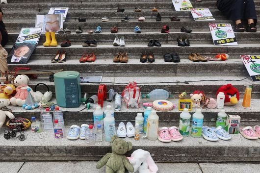 지난 8월 28일 서울 종로구 세종문화회관 계단에서 열린 가습기살균제 참사 14주년 기자회견에서 태아, 영유아, 어린이 피해 추모를 위한 유품들과 가습기 살균제 등이 전시돼 있다. 연합뉴스 |