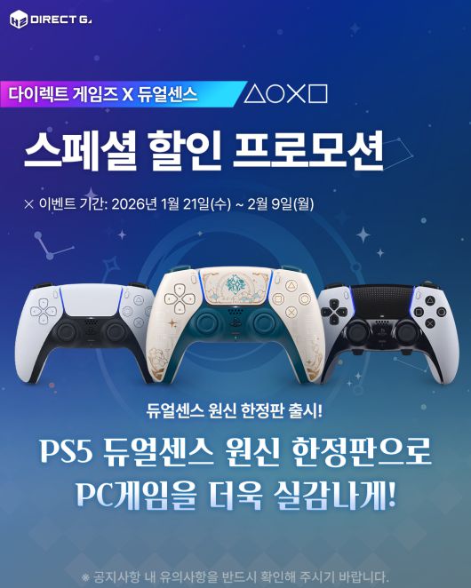 오늘(1월 21일)부터 진행되는 ‘다이렉트 게임즈 X 듀얼센스’ 이벤트 기간 동안, 다이렉트 게임즈에서 ‘듀얼센스 무선 컨트롤러 – 원신 한정판’을 구매한 유저를 대상으로 네이버페이 포인트 쿠폰 증정 이벤트를 실시한다. 해당 쿠폰은 주문 건당 1회 제공되며, 2026년 2월 28일(토)까지 교환 가능하다.