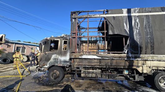[울산=뉴시스] 박수지 기자 = 21일 오후 2시26분께 울산 북구 중산동 한 정비소에 정차된 4.5t 트럭에서 불이 났다.