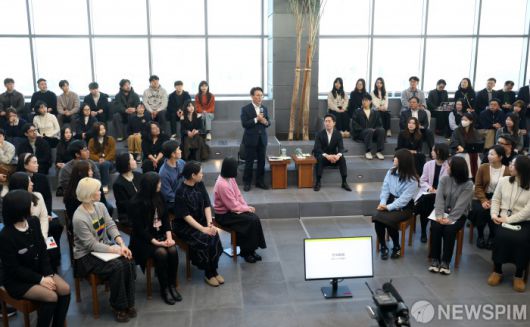 [서울=뉴스핌] 정일구 기자 = 김민석 국무총리가 21일 오후 서울 용산구 하이브 사옥에서 열린 청년 종사자 타운홀 미팅에서 인사말을 하고 있다. 2026.01.21 mironj19@newspim.com