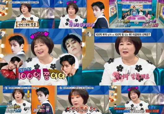 또한 MC 장도연은 이금희만을 위한 밸런스 게임을 던진다. 첫 번째로 ‘100억 자산이 있는 평범한 남자 vs 100억 빚이 있는 잘생긴 남자’라는 선택지에 이금희는 “100억은 제가 못 갚을 것 같아요.”라고 대답한다.