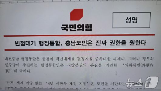 (대전·충남=뉴스1) 김태완 기자 = 국민의힘 충남도당은 21일 정부와 더불어민주당이 추진 중인 대전·충남 행정통합안과 관련해 “지방분권의 본질을 외면한 '빈껍데기 행정통합'”이라고 강하게 반발했다.