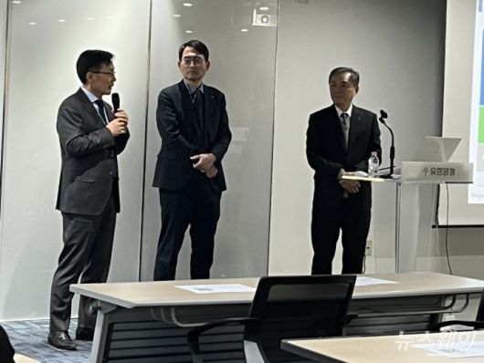 (왼쪽부터) 조학렬 유한양행 뉴 모달리티 부문장, 최영기 중앙연구소장, 김열홍 R&D 총괄 사장 / 사진=현정인 기자 |