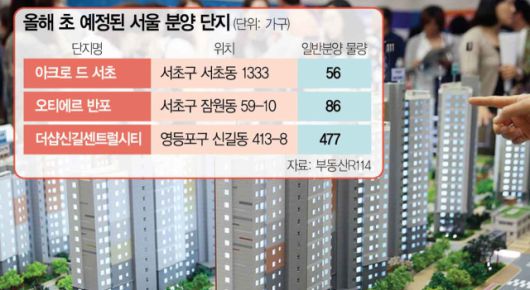 올해 첫 분양 단지의 경쟁률을 기초로 했을 때 이달 하순 이후 예정된 강남 알짜단지들은 세자릿수의 높은 경쟁률이 나타날 것이라는 전망이 나온다. 이달에는 ‘대어’로 주목받는 단지 ‘아크로 드 서초’가 분양을 앞두고 있다. 총 1161가구 중 일반분양 물량은 56가구이며 분양가는 3.3㎡당 약 7900만 원 안팎으로 책정될 것으로 추정된다. 59㎡의 분양가는 20억 원 안팎으로 추정되는데, 이 경우 시세 차익은 15억 원에 달할 전망이다.