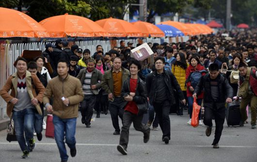 2020년 중국 남부 광동성 광저우 역 앞에서 사람들이 기차표 예매를 위한 줄을 서기 위해 달려가고 있다. /AFP 연합뉴스 |