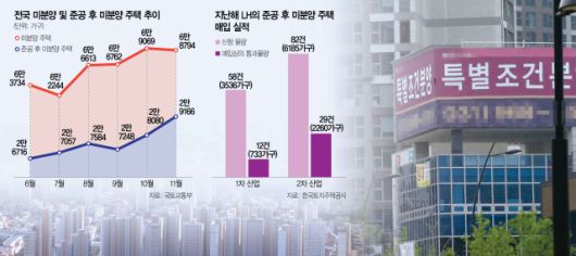21일 국토교통부에 따르면 지난해 11월 기준 전국 준공 후 미분양 주택은 2만 9166가구에 달하는 것으로 나타났다. 이는 전월(2만 8080가구)보다 3.9% 증가한 수치로 2012년 3월(3만 438가구) 이후 13년 8개월 만의 최대치다. 준공 후 미분양 주택의 85%가량은 지방에서 발생했다. 대구(3719가구)와 경남(3262가구), 경북(3081가구), 부산(2655가구), 충남(2142가구) 등에서 악성 미분양이 해소되지 않는 상황이다.