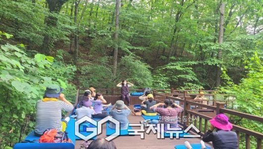 국립산림치유원 ‘시니어웰라이프사업’에 참여한 참가자들이 숲에서 신체 활동을 하고 있다. (한국산림복지진흥원 국립산림치유원 제공.) |