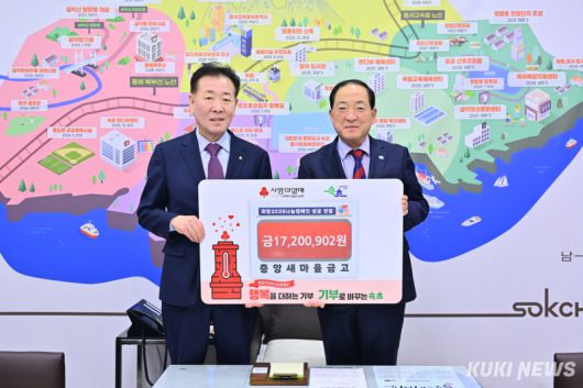 강원 속초시(시장 이병선)에 위치한 중앙새마을금고(이사장 한상기·사진 오른쪽)는 21일 속초시청을 찾아 시 관내 시설 및 단체 9곳에 지정기탁할 성금 1720만902원을 전달했다.